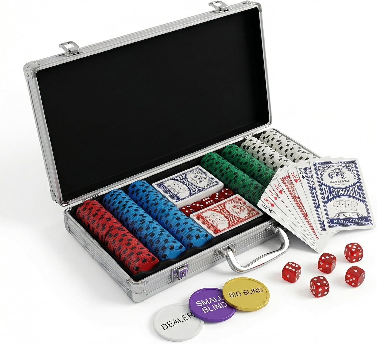 | Included Components | 500 Chips, 2 Poker Cards, 5 Dice, Small Blind, Big Blind, Dealer button, Poker Chip Case |